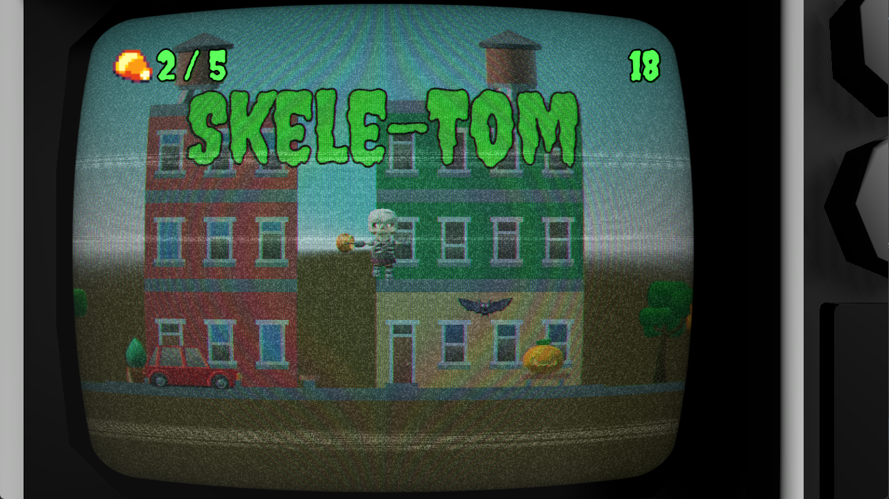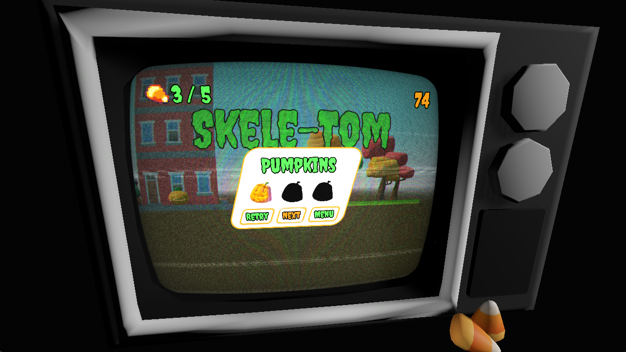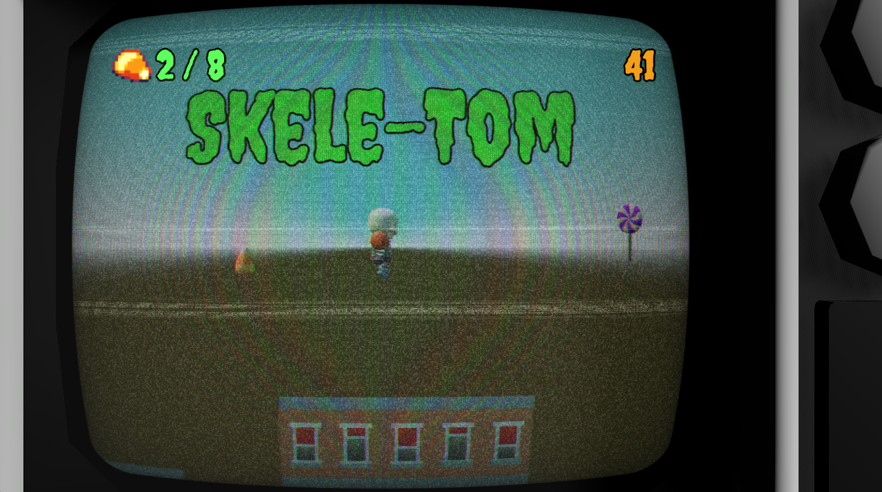 So the TV was provided as a model, and I started thinking about how it was an old school CRT, so why not make a game that felt like an old school platformer? Basically jump, collect candy and avoid traps. The "monsters" could be angry costumed trick-or-treaters. I thought I would try incorporating the TV model itself into the beginning of the game.